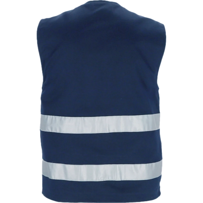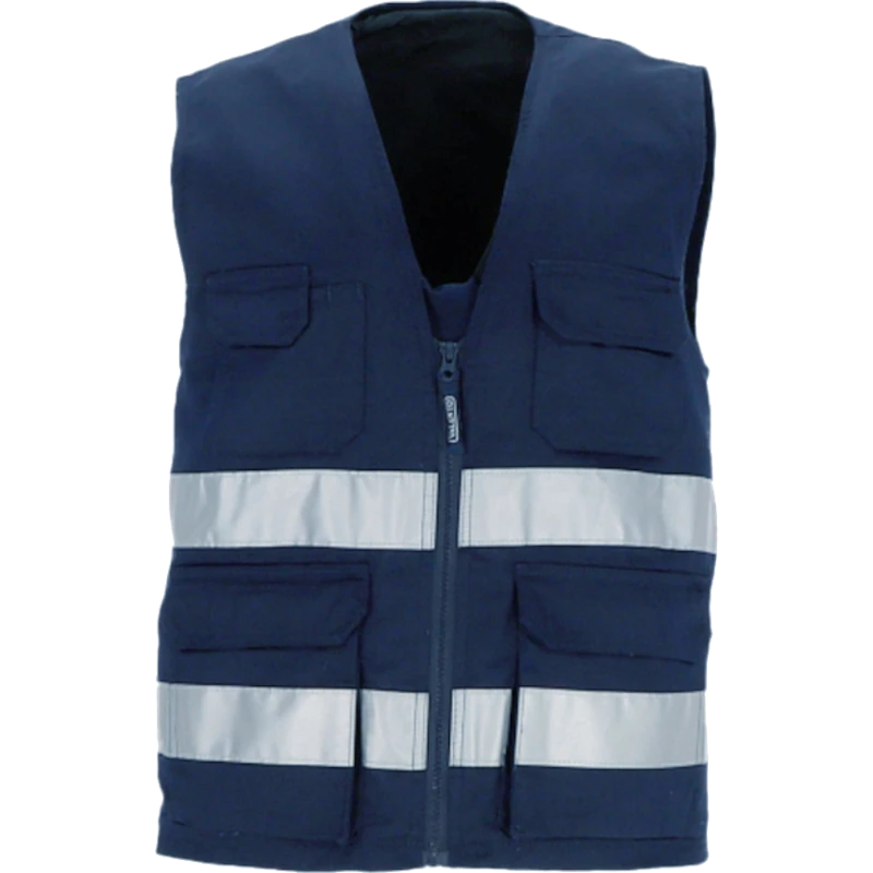 Colete azul-marinho com bolsos frontais e duas faixas retrorrefletoras horizontais.