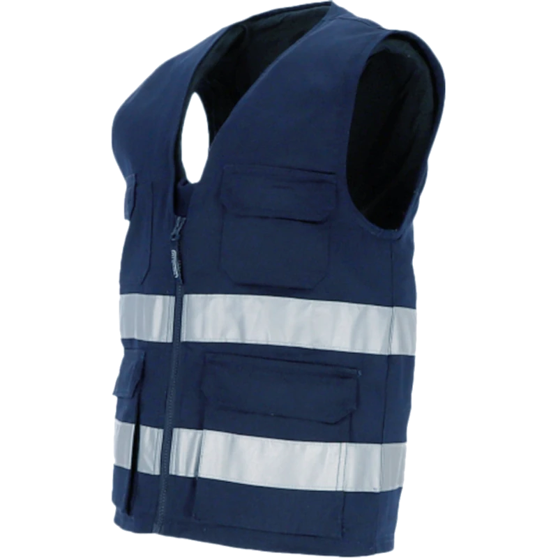 Colete azul-marinho com fecho frontal, múltiplos bolsos e faixas retrorrefletoras.