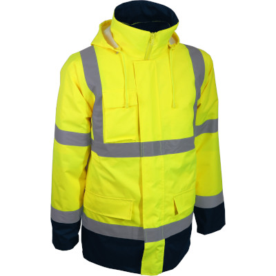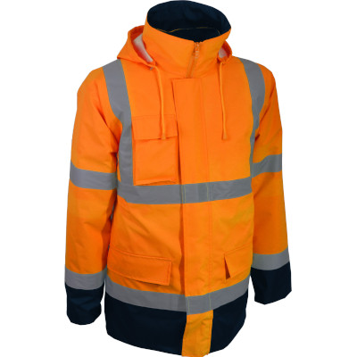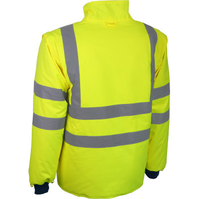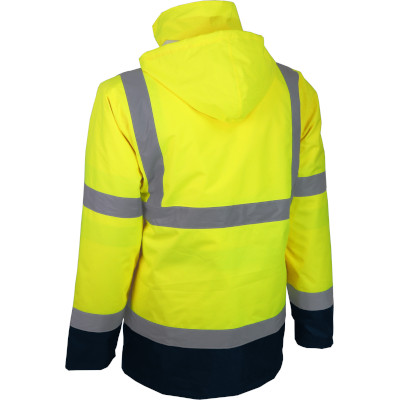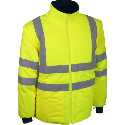 - Material exterior: 100% poliéster (Oxford 300D), revestido com PU, 170 g/m² - Forro: 100% poliéster tafetá, 55 g/m² - Enchimento: 100% poliéster, 180 g/m² - Mangas destacáveis - 2 bolsos externos e 2 bolsos internos - Fecho de correr - Punhos de malha - Fitas retro-refletoras |
